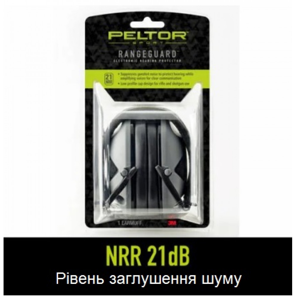 Электронные наушники для защиты слуха Peltor Sport RangeGuard ингибирует оружейные выстрелы для защиты слуха одновременно с усилением голоса для четкой связи. Уровень шумоподавления (NRR) равен 21 децибелам. Низкопрофильный дизайн чашек позволяет удобно работать с ружьями, винтовками и дробовиками. Одиночная, наружная крышка аккумуляторного отсека. Регулируемое мягкое оголовье. Прочные встроенные микрофоны.